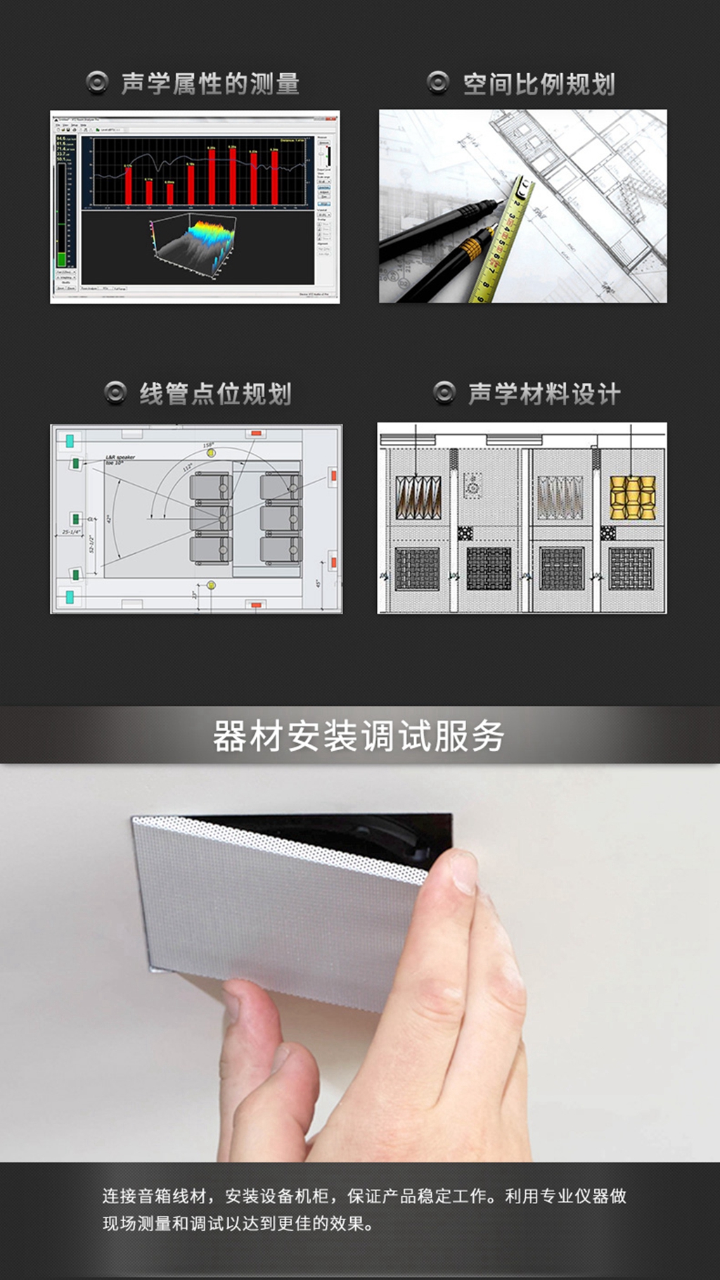 我們會(huì)根據(jù)客戶(hù)您喜歡的品牌和風(fēng)格、提供的系統(tǒng)預(yù)算和影音室的面積容積等要素,確定您的影音系統(tǒng)需要的功放功率的大小、音箱線材的品牌風(fēng)格、投影機(jī)的顯示技術(shù)以及房間的聲學(xué)處理等參數(shù)和設(shè)計(jì),拿出最專(zhuān)業(yè)的最先進(jìn)的最高性?xún)r(jià)比的系統(tǒng)配置方案,以及設(shè)計(jì)安裝定位的實(shí)施計(jì)劃,這就是他們極其重要的服務(wù)內(nèi)容,更為重要的是他們的工程師可以親臨您的影音室安裝預(yù)埋線材、并提前提取安裝施工第一手資料,讓您和家人在繁忙之余,足不出戶(hù)就能真正體驗(yàn)高清環(huán)繞聲極致震撼的影音效果,國(guó)際標(biāo)準(zhǔn)化的視聽(tīng)環(huán)境,帶來(lái)真正的影院級(jí)奢華享受