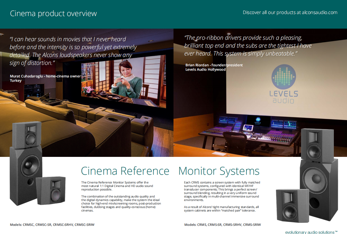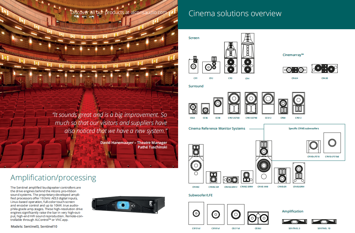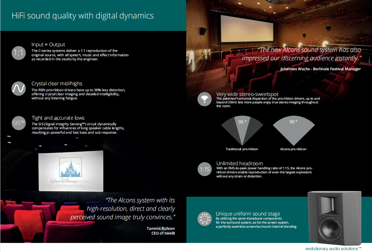 Alcons團(tuán)隊(duì)把這一杰出成果應(yīng)用到數(shù)字影院音響系統(tǒng)——C系列。C系列能提供HiFi聲質(zhì)以及完美的清晰度,讓觀眾長(zhǎng)時(shí)間觀看電影都不會(huì)出現(xiàn)聽覺疲勞。聲壓級(jí)覆蓋整個(gè)空間,大大提升遠(yuǎn)離屏幕的觀眾聽覺上的享受,讓所有觀眾都能感受身臨其境的效果,讓觀眾與電影更親近。