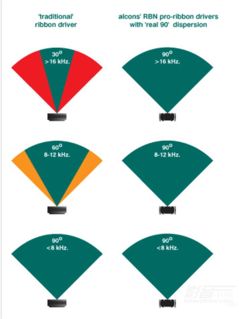 RBN專業(yè)鋁帶驅(qū)動器在高端音響市場大受歡迎,其出現(xiàn)是鋁帶驅(qū)動領(lǐng)域,甚至是音響領(lǐng)域的重大突破。首先,RBN驅(qū)動器失真度極低,總諧波失真度僅為壓縮式驅(qū)動器的十分之一。由于振動質(zhì)量極小,能提供快速的瞬態(tài)響應(yīng),沒有“壓縮上限”,能實現(xiàn)精確的聲音再現(xiàn)。其次,RBN驅(qū)動器是當前唯一可以提供90°水平覆蓋的驅(qū)動器,Alcons已就這一技術(shù)申請專利,RBN驅(qū)動器能提供極高的功率以及1:15的動態(tài)范圍。