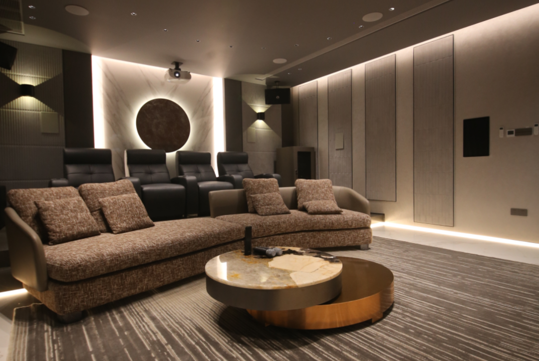 確定設計思路:影音室的整體裝修風格整體風格是一個影音室的靈魂,不僅為我們帶來視覺的沖擊,能讓我們更加熱衷于在影音室待著,賽賓薈根據業主別墅的整體裝修風格,又巧妙結合業主個人意愿,確定打造一間“簡約新中式”影音室。裝修是一個大工程,從一間毛胚質地的空間,到專業的聲學裝修影音空間,從里至外都經過了嚴謹的防水、防潮、吸音、隔音、降噪、減震裝修方案,以達到專業的影音室標準。在前方幕布后方設計空腔設備間,影院主音箱、中置音箱、低音炮、KTV主音箱、以及機柜(內包括日本天龍功放、藍光機、媒體中心KTV點歌機、效果器、電源時序器、智能總控)按照專業的音箱定位,將設備隱藏在幕布后方,除了極大的簡約美化空間外,也能非常好的保護設備不受外力的損害。天花.地板、四面墻身構建:安裝專業的聲學隔音門,極大的阻隔室內環境對外界環境的影響。并于四面墻身,鋪貼隔音氈、空腔填隔音棉、九厘夾板聲學裝飾軟、硬包,做好室內聲學裝修構建。影音室完全遵循定制安裝的設計,線路隱藏,設備定制入墻,讓表面極致簡約,實現了效果圖和實景交付的效果達到95%還原度。