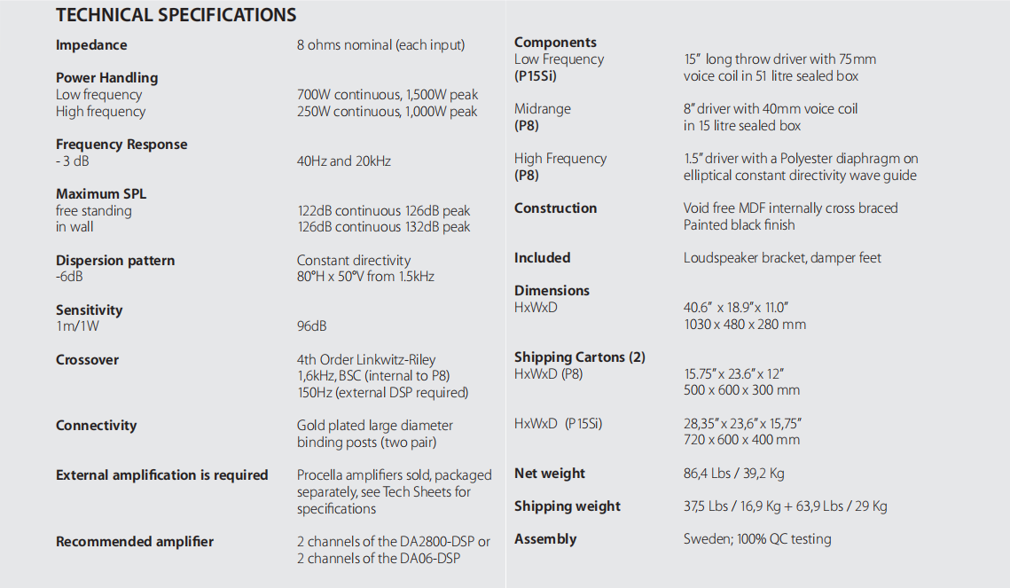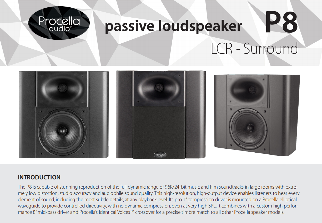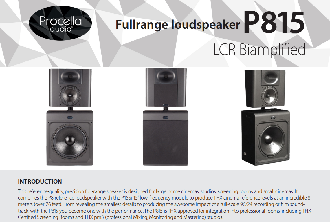 Procella Audio P815具備參考級質量,精準的全音域音箱適合大型的家庭影院,錄音室,放映室和小型劇院;結合P8的中/高音喇叭和LF815的設計令低頻響應延伸至40Hz;搭配量身定做的寶仙娜DA05/06-DSP兩聲道數字功率放大器能使其達到最佳性能。