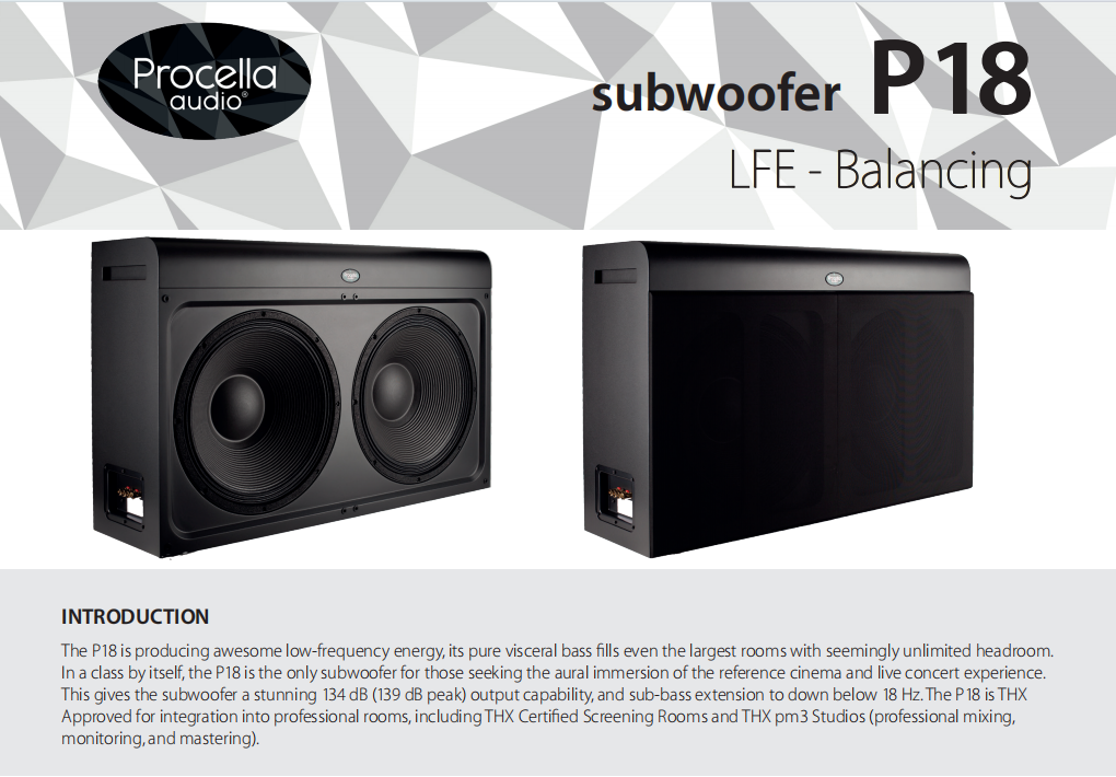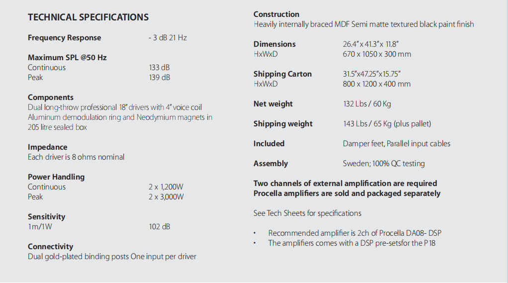 P18采用雙18英寸意大利高級低音單元構成,與Procella(寶仙娜)DA06-DSP功放搭配使用,能輸出令人難以置信的133dB的聲壓并且低頻能延伸至18Hz以下,有著極高的輸出聲壓和動態范圍。